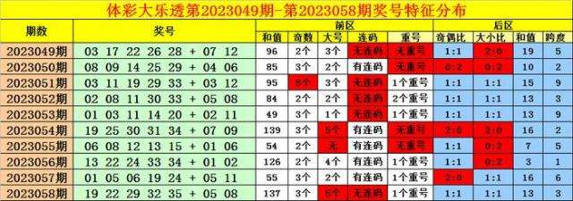 上期回顾:体彩大乐透第2023058期奖号:19 22 29 32 35+05 08。前区和值为137,3个奇数,5个大号,无连码,1个重号;后区奇偶比1:1,大小比1:1,和值13,跨度3。