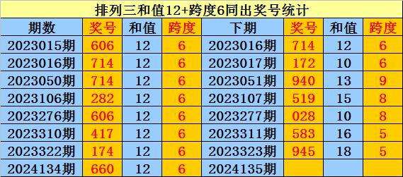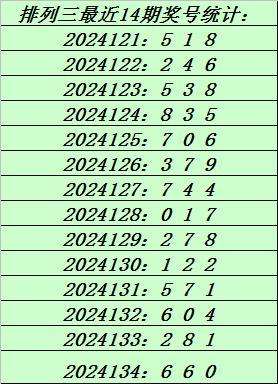 上期回顾:排列三第2024134期奖号:660。和值12,跨度6。