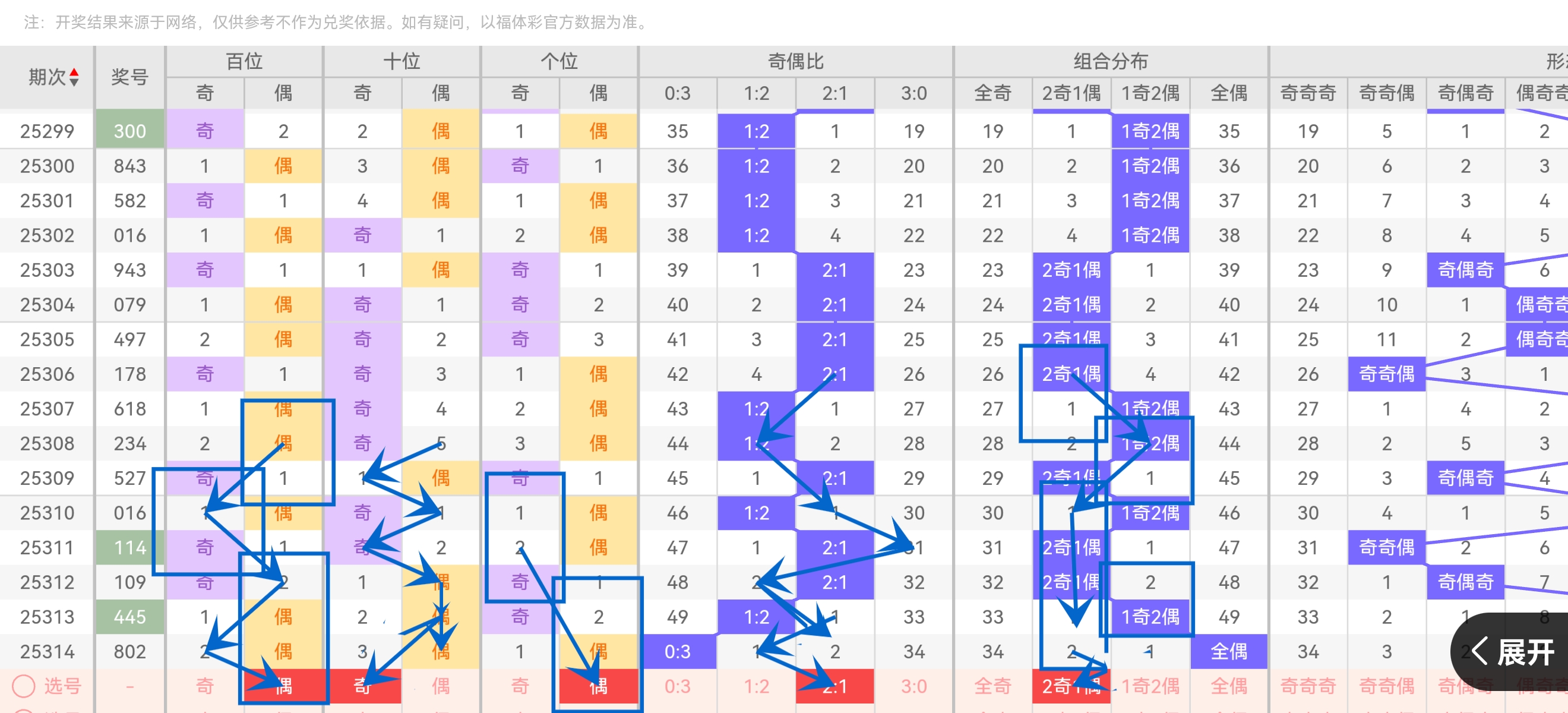 规律:奇数连续两期走弱(第25313期1奇、第25314期0奇),历史数据显示奇数常在第3-4期反弹(概率约60%)。偶数虽热,但过热后易回调。