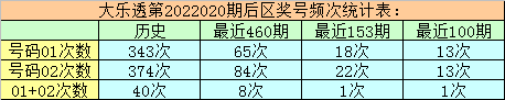 万妙仙大乐透第2022020期前区热号分析:(统计最近460期数据)