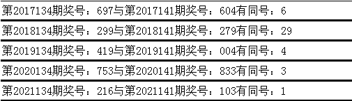 与前期历史同期奖号对比分析,在最近五年开奖中,第134期同期奖号与第141期同期奖号都出现了相同号码: