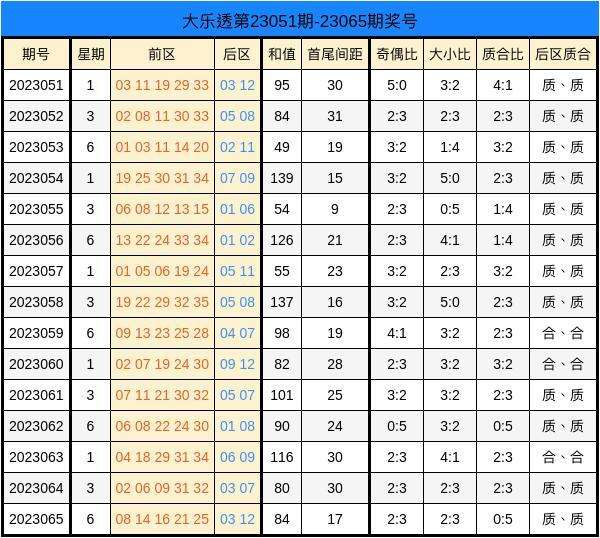 上期回顾:大乐透23065期开出奖号:前区08、14、16、21、25,后区03、12。当期前区号码大小比为2:3,三区比为1:3:1,奇偶比为2:3。后区分别开出“小、大”,“奇、偶”形态。