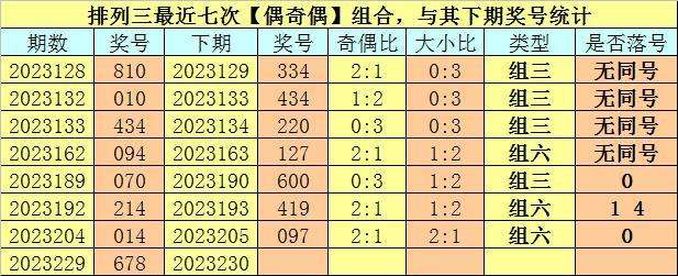 奇偶分析:排列三上期奖号为678,其奇偶类型为【偶奇偶】,最近七次出现奇偶类型偶奇偶的号码分别为:810、010、434、094、070、214、014,其下期奖号分别为:810、010、434、094、070、214、014。其中号码奇偶比为9:12,奇偶奖号开出比例基本相当,本期奇数热出的可能性较大,预计出现2个奇数号码。