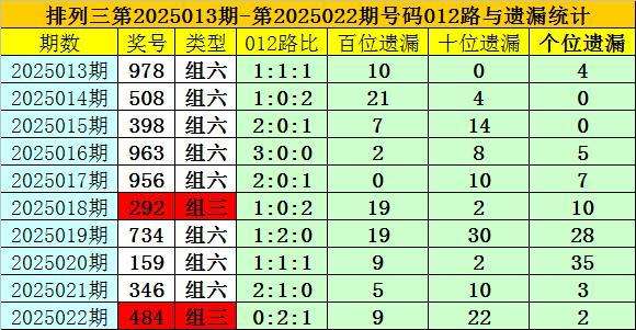 开奖回顾:排列三第2025022期奖号为:484,类型为组三,号码012路比为0:2:1,百十个位号码直选分别遗漏9期、22期和2期。