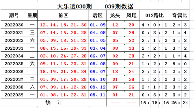 大乐透第2022039期开奖号码为前区:01、08、11、22、31,后区05、11。前区大小比为2:3,奇偶比为3:2,012路比为0:3:2,后区为小号+大号、奇数+奇数。