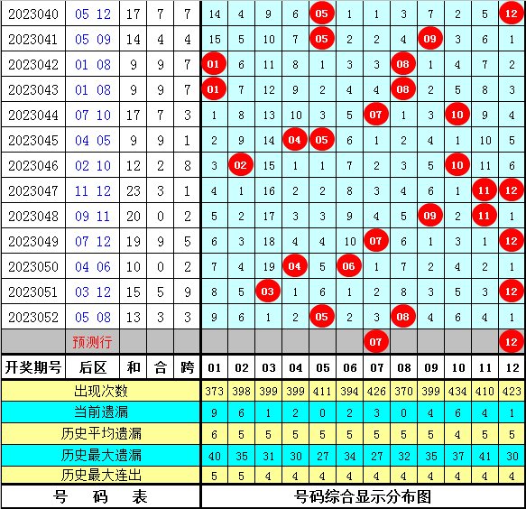 后区5码参考:01 02 07 09 12