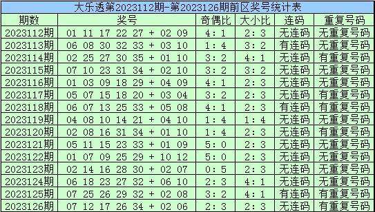 体彩大乐透第23126期奖号开出:07 12 17 26 34+02 06,前区奇偶比为2:3,大小比为2:3,无连码,开出2个重复号码:07、26。