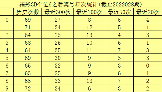 个位杀号:上期个位奖号为6,历史上个位奖号6共开出671次,最近100次个位奖号6出现时,其下期号码0-9开出次数分别为:奖号2、8开出13次,1开出12次,4开出11次,3开出10次,5、6、7开出9次,0开出8次,9开出6次。