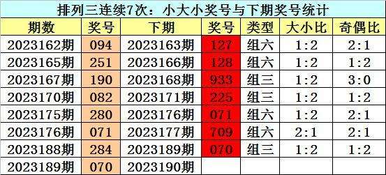 大小判断:上期排列三奖号为070,大小为:小大小,近7次大小为小大小的奖号为:094-251-190-082-280-071-284。