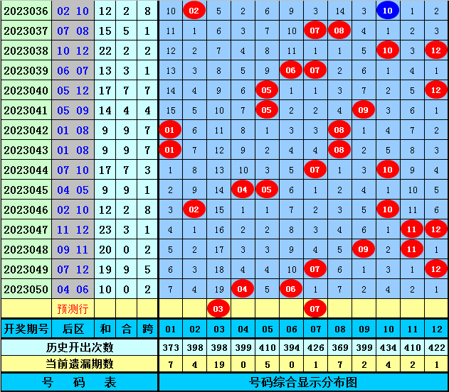 后区分析:后区上期开出1路+0路奖号04和06,最近20期后区0路奖号开出11个,1路奖号出现15个,2路奖号出现14个,最近8期后区0路奖号出现4个,1路奖号出现7个,2路奖号出现5个,本期后区注意号码:02、03、05、07、08,单挑两码组合03+07。