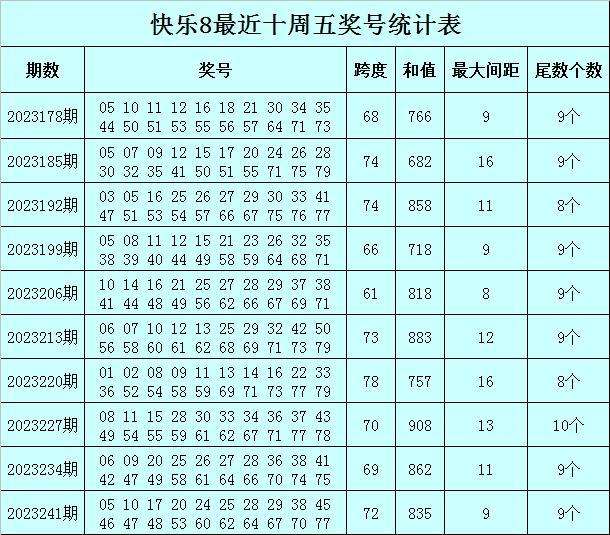 福彩快乐8第2023241期(上周五)回顾:05 10 17 20 24 25 28 29 38 45 46 47 48 53 60 62 64 67 70 77,其中奖号首尾间距为72,和值为835,最大间距为9,尾数分布为:尾数1包含0个号码,尾数2、3、6、9包含1个号码,尾数4包含2个号码,尾数5、8包含3个号码,尾数0、7包含4个号码。