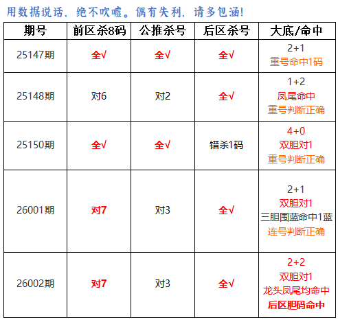 上期前区杀8码对7,公推前区杀4码对3,后区杀号全对。