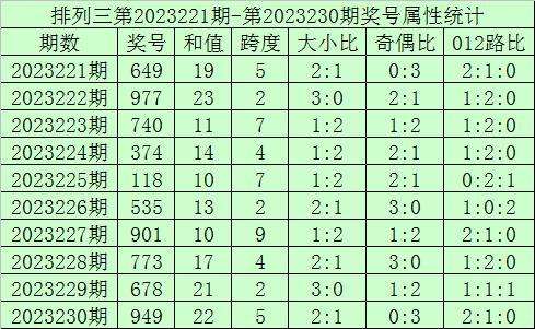 上期回顾:排列三第2023230期开奖号:949,奖号和值:22,奇偶比0:3,大小比2:1。