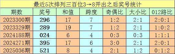 1、排列三最近两期百位号码分别开出3和8,历史上百位号码连续两期分别开出3和8的奖号出现了94期。前五期开出之后其下期奖号分别为:296、289、024、395、521;