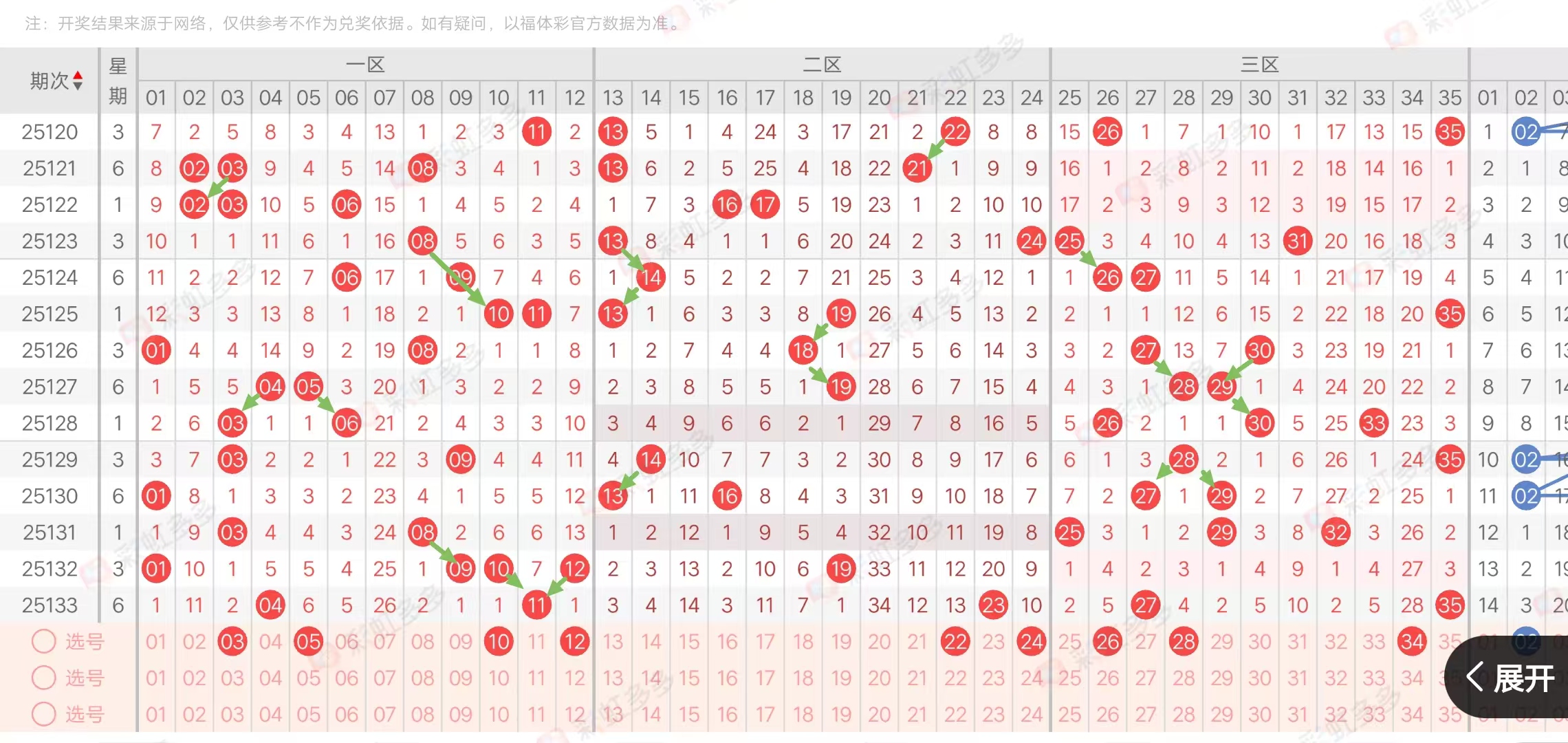 从走势图可以看出,邻码,在开奖号码当中也是很常见的,近期连续走热,近期出号个数为:031,002211112,0032133,03,011,近期出0个较多,出完1枚多出1-3枚,所以本期邻码3.5.10.12.22.24.26.28.34选1枚,防2枚,防号码2.8.10.18.20