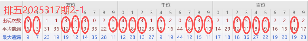 下图所圈出的为近30期各位置所出现的热码出现次数及平均遗漏值,用以参考和一些冷码组合选号。