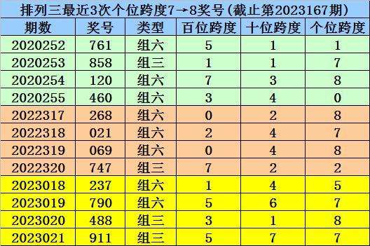 末位跨度分析:前3期末位奖号为1-8-0,最近两期末位奖号跨度为7、8,末位奖号跨度历史上连续两期开出7、8的现象共27次,其最近两次奖号为: