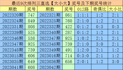上期回顾:排列三第2023041期奖号为608,组六,大小比开出2:1,直选分布为:大小大。