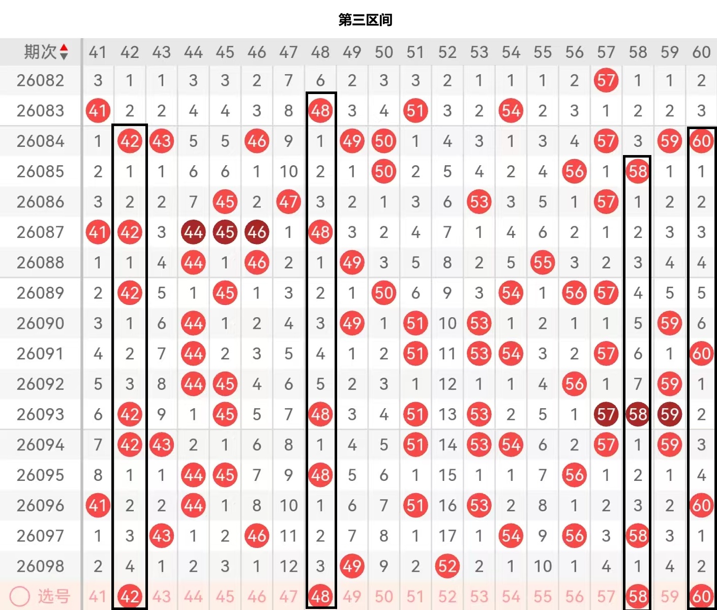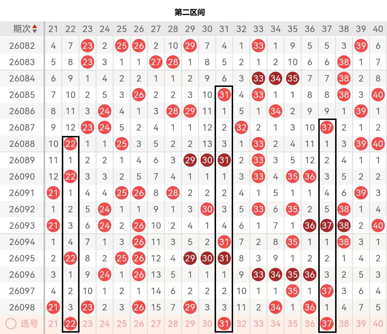 上期第二区间开出了(21 23 26 29 34 36)六个号码球,上期热态六码在二区间落位。区间号码走出热态六码落位。那么通过对上期二区间落位号码进行研判我们可以发现整个区间号码走出区域落位,区间前端开出21-23对应,区间后端34-36对应号码球开出。那么通过对二区间号码的落位趋势进行分析可以看到二区间的走势在本期落位后趋势向温态回调的可能性最大。那么本期我们在二区间进行操作时一定要加强对二区间形态号码球的研判,所以我们在二区间进行操作时一定要考虑区间热态号码更为合理。