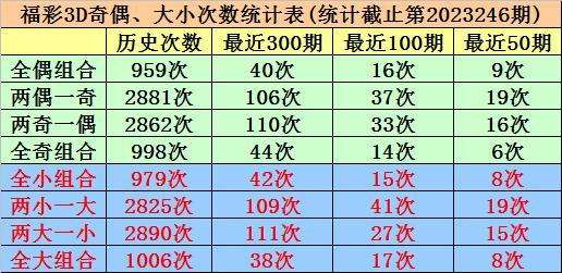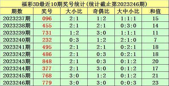 开奖回顾:福彩3D第2023246期奖号为:779。奖号类型为组三,和值为23,奇偶比为3:0,跨度为2,012路比为1:2:0,大小比为3:0。