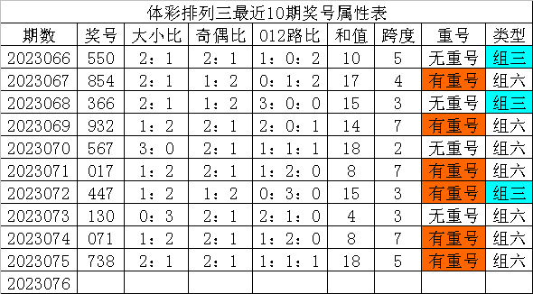 体彩排列三最近10期分别开出奖号:550、854、366、932、567、017、447、130、071、738,各奖号属性详见下表: