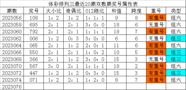 体彩排列三最近20期双数期奖号分别为:108、693、792、006、065、550、366、567、447、071,各期奖号详细属性下表: