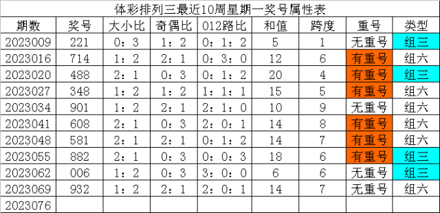体彩排列三最近10周星期一奖号分别为:221、714、488、348、901、608、581、882、006、932,各奖号属性详见下表: