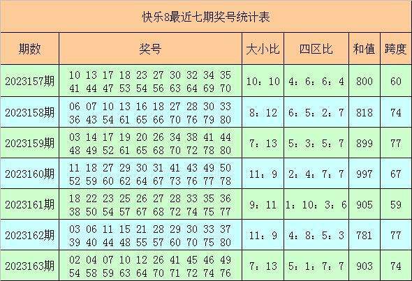 福彩快乐8第2023163期开出奖号:02 04 07 10 12 26 41 45 46 49 54 58 59 63 64 70 71 72 74 76,其中奖号大小比为14:6,四区比为5:1:7:7,和值为903,跨度为74。