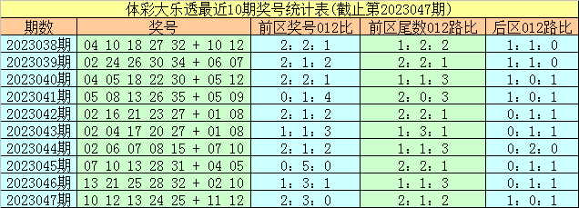 上期回顾:体彩大乐透第2023047期开出奖号:10 12 13 24 25 + 11 12,其中前区奖号012路比为2:3:0,前区尾数012路比为2:1:2,后区奖号012路比为1:0:1。