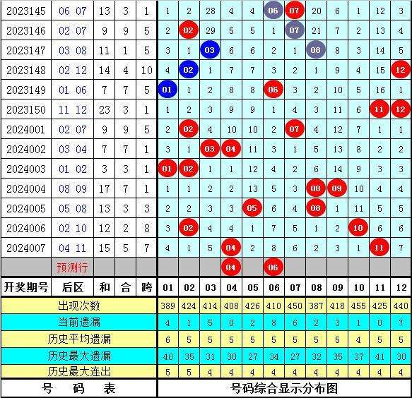 后区上期开出奖号:04+11,前6次后区奖号04+11出现之后,其下期分别开出号码:01+07、05+12、01+07、02+08、04+05、02+09,本期后区注意五码04 06 09 11,单挑两码04 06。