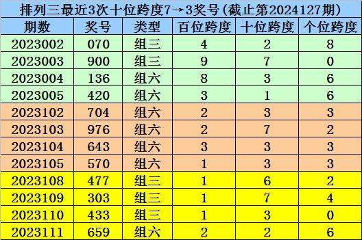 首位跨度分析:首位号码最近3期奖号为7-3-7,连续两期跨度为4、4,历史上首位号码连续两期分别开出跨度4、4的现象共出现102次,其前两次开出奖号分别为: