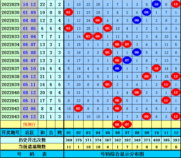 后区分析(定义:01-04为一区,05-08为二区,09-12为三区):上期后区开出奖号09和12,全在第三区出现,,最近10期后区三个区间落号个数比为1:11:8,本期后区看好第二区号码大热,注意两码06、07。