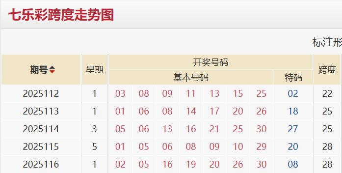 近五期七乐彩开奖号码跨度依次为22→25→25→28→28。周期跨度均值为26。周期跨度振幅为6。周期修正跨度振幅为4。基于动态平衡干预以及波动趋势衡量,本期开奖跨度推测区间为22-30。基于风险对冲策略,本期开奖跨度区间缩水为22-28。