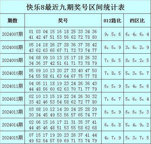 福彩快乐8第2024015期开出奖号:07 15 17 19 20 23 26 37 41 44 49 52 54 57 59 69 71 73 74 79,其中奖号012路比为4:7:9,四区比为5:3:7:7。