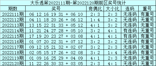 上期回顾:体彩大乐透第22120期奖号开出:11 22 26 30 33+03 05,前区奖号奇偶比为2:3,012路比为2:1:2,大小比为4:1,没有开出连码,没有开出重号。