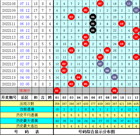 后区分析:上期后区奖号为03和05,最近10期后区各号码频次为:号码05、12出现3次,02、03、06、07、08、10出现2次,04、09出现1次,其中号码01、11没有出现,本期后区参考号码01、04、05、06、09、11,单注参考01+09。