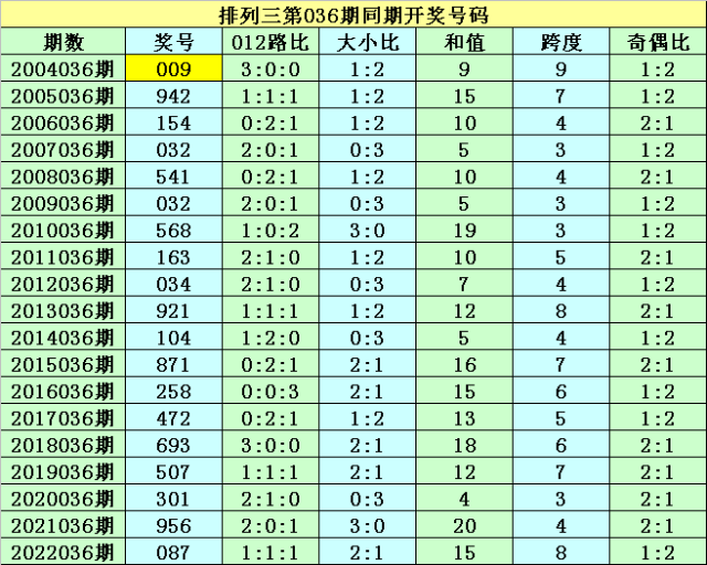 本期为排列三第2023036期开奖,开奖日期为:2023年2月15日,历史上排列三第036期已开出了19次奖号,历年同期开出号码分别为:009-942-154-032-541-032-568-163-034-921-104-871-258-472-693-507-301-956-087。