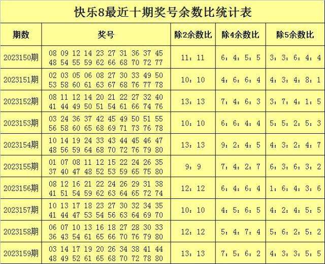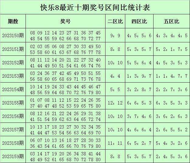 福彩快乐8第2023159期开奖回顾:03 14 17 19 20 26 34 38 41 44 48 49 52 61 65 68 70 72 78 80,其中奖号二区比为12:8,四区比为5:3:5:7,五区比为2:4:5:3:6,除2余数比为7:13,除4余数比为7:5:6:2,除5余数比为4:3:3:5:5。