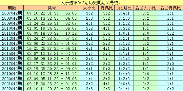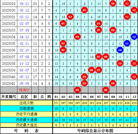 后区判断:后区第042期历史同期奖号大小比总比例为12:20,大号出现较少,本期看好大号回补,注意开出一大一小组合,两码参考04、08。