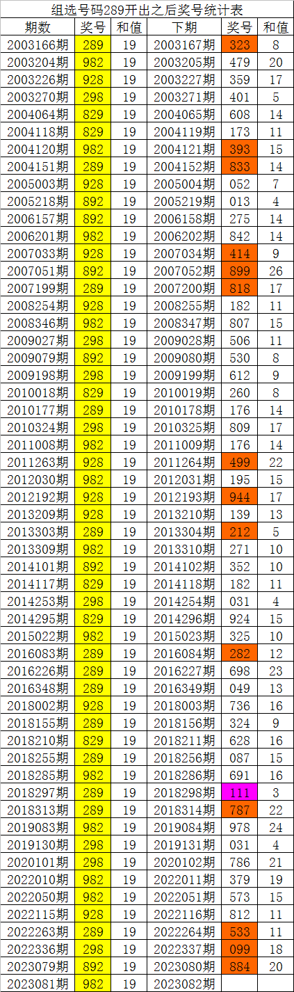 从以上统计可以看出,直选号码982出现之后,其下期奖号:1。下期大号出现概率100%;2。下期质数出现概率100%;