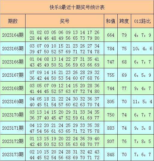 快乐8第2023173期奖号为:02 10 15 20 24 28 31 32 42 43 44 45 52 54 56 68 69 70 71 72,其中奖号012路比为7:6:7,和值为848,跨度为70。