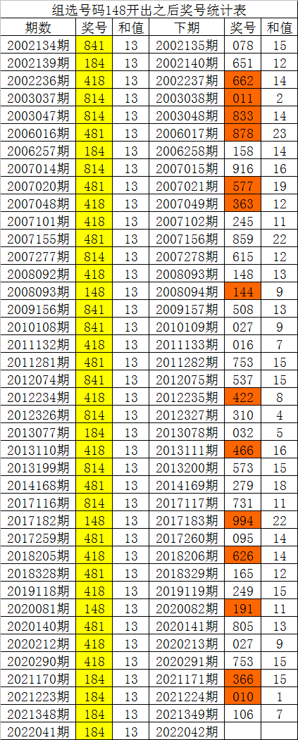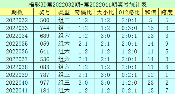 一、上期回顾:福利彩票3D第2022041期开奖结果:奖号为184,奖号和值为:13,奖号跨度为:7。