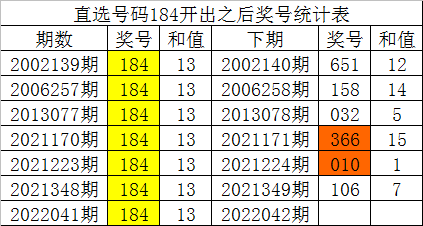 福彩3D第2022041期开出直选号码为:184,该直选号码历史上出现了7次,其下期分别开出了号码:651、158、032、366、010、106,如图: