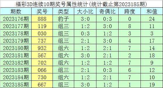 开奖回顾:福彩3D第2023185期奖号为667。奖号形态为组三,大小形态为大大大,奇偶形态为偶偶奇,和值为19,跨度为1。