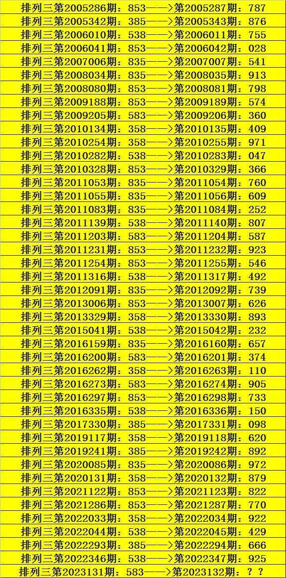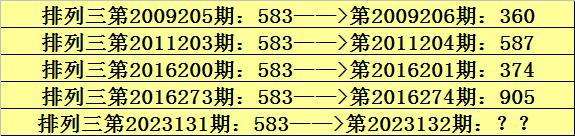 第2023131期排列三奖号为583,历史上该号码直选出现5次,下期奖号分别为:360、587、374、905。