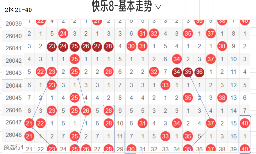 二区(21-40):遗漏5期以下有15个,0码21 25 33 35 4个,数据所示,冷码平均,选择条件增多了.上期开出了4个号码,出码比较集中.这期布防相应增加,重码按比例落这区较少,先给出关联码23,这个区间间接走势,温区,21-30区间上期开了2个,依旧不是重点选号区间,31-40区间开出2个,本期关注热码的回补,间隔小遗漏值最佳,3字头转热,这个小区热码注意回调,可以做关联码的布局,注重温冷码的回补.