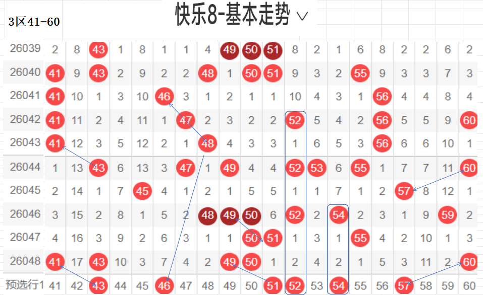三区(41-60):遗漏5期以下有16码,0码41 43 49 50 60 5个,温开方式,这区码数有回暖之意,可以防一手,先定胆码走势较大者,隔期,斜三连,分边号码,可重防,间隔5期以上号码可以随走势选取,例如本期大冷码,走势比较大,可以做胆,通常联动可带出,分边对称的号码,本区间也有很大走势.可关注下.隐形夹角号码.做补位形态号码.都需要观察动态走势.以上是本区间的选码方法.