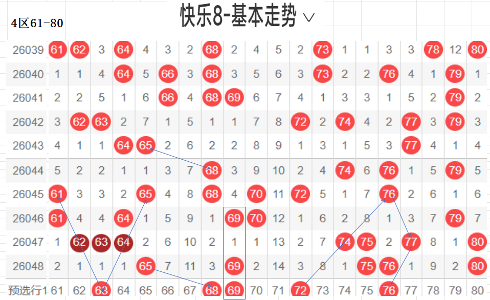 四区:(61-80):遗漏5期(含5)以下有15码,0码65 69 75 76 80 5个,平均温开方式,上期开出5码,区间回暖,后区可防,四区间从以往数据来看,重码很强,一枝独秀的存在,近期有回补走热的趋势,区间回暖后,本区间后区可防,与一区相比,也是温区.,对称下落码,隔期回补码,可以防守,这区对呈对称三角关系的胆码,斜三连有走势的胆码,联动落位码,都有各自的走向落位关系,根据走势选择一种方式选码.