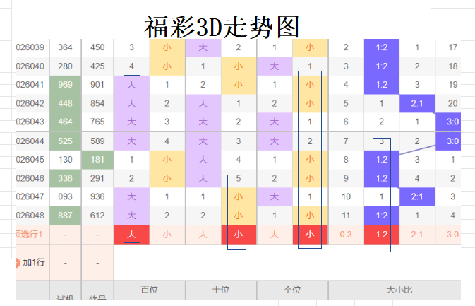 2:如图所示,上期1大2小走势.个位的走势出1小,十位出2小,百位出2大.比例为1:2.本期给出的推测是1大2小.个位小码:01234.十位小码:01234,百位大码:56789.这是给出的范围.下面通过其他走势缩小范围.