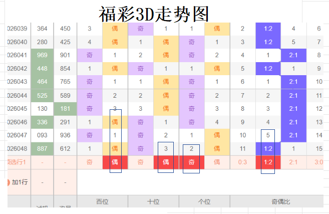 3:如图所示数据,上期开出1奇2偶,个位为偶,开2期.十位为奇,开3期.百位为偶,开1期.比例1:2.本期推测1奇2偶,个位为奇,13579.十位为偶,02468,百位为奇,13579.结合下大小分析进行缩小